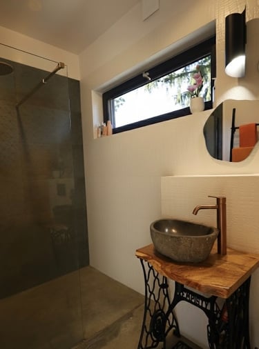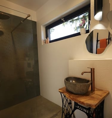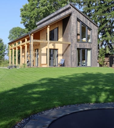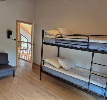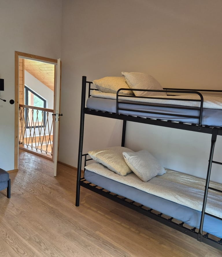 Spacious house with two bedrooms (a double bedroom and a bedroom with a bunk bed and a sofa bed/folding bed), a guest room, a dining room with a kitchen, a bathroom, and a utility room.
