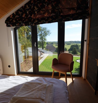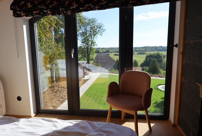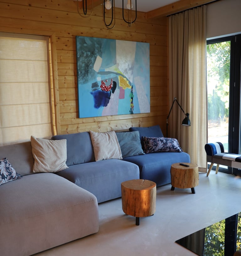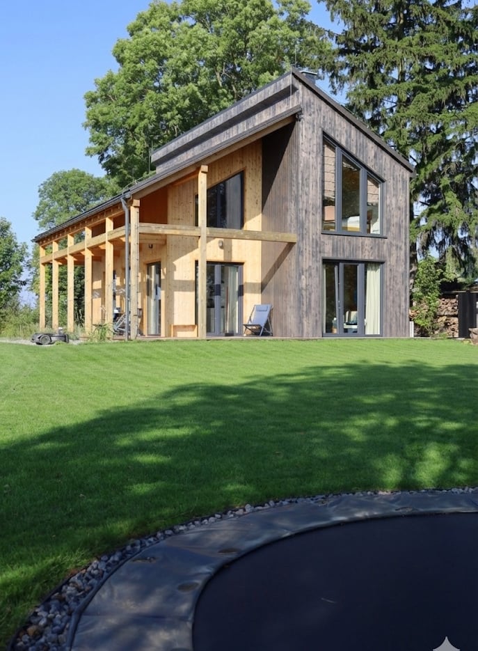 The house is available all year round, featuring underfloor heating, a wood-burning fireplace, and air conditioners in every room.